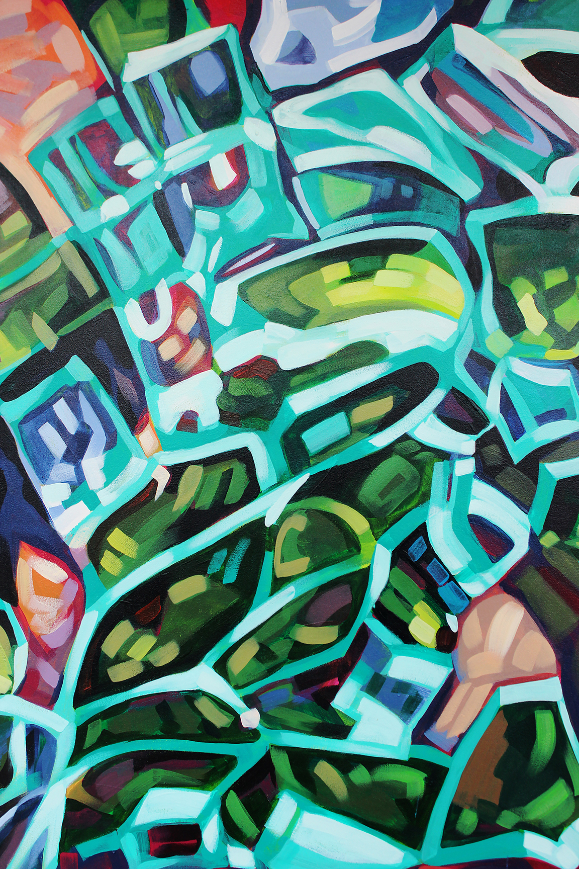 The Glass Chronicles began as an exercise in seeing how many times removed Mollie Thonneson could continue to create artwork based on a single image. From the original photograph of broken windshield glass scattered on a sidewalk She has created a realistic oil painting, six stylized acrylic paintings, a silk-screen print edition and twelve fabric pieces. Each new artwork is used as the reference for the next one. The different mediums are allowed to have their own voice and tell their own story yet they continue to express the same explosive energy that broke the glass in the first place.