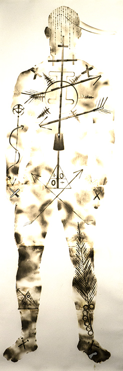 The works in this series created through the use of fire and branding, provide a body of work that pushes its limits by using minimal materials; work that enables a connection to history, a courageous confrontation of meaning and myth. The works in this series are branded with branding irons, bolts, chains, nails and various metal objects, as to suggest a “primitive” magical transformation, a process of burning messages encoded with meaning and history. In the branding drawings, sacred symbols (signs), appear artistic as well as mystical- aesthetically compelling, multi-layered, encoded with meaning and beautiful symmetry. Images strongly influenced by Castro’s knowledge of indigenous cultures and Afro-Cuban religions: a belief in a Divine power and a direct connection to that Supreme force. Castro uses ideograms, sacred symbols, found in these belief systems to serve as a catalyst for manifestations: ideograms to call down the spirit to motivate forces into action; a direct connection to nature itself by using the stars, moon, sun to communicate with celestial beings; graphic symbols that represent the identification of a series of supernatural phenomena.