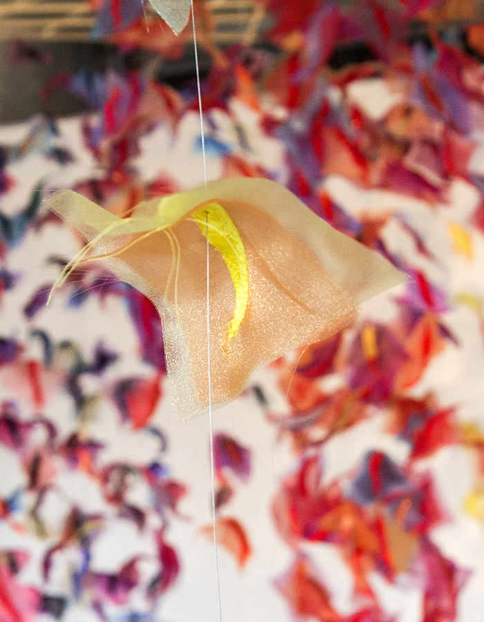 The Woman’s March on Washington and the parallel marches held throughout the world were a phenomenal success in demonstrating millions of women’s collective passion for the whole of humanity. Spring boarding from the event’s organic moniker, Pussy Power, Thonneson examines the relationship between fragility and strength within the context of femininity and the individual-versus-collective conversation. To highlight the delicate and temporary nature of life Thonneson finds a metaphor in swarms of butterflies also known as rabbles. Her sewn fabric forms are undeniably female and they reference work traditionally done by women. Thonneson’s interest in systems and processes of repetition have been influenced by her experiences working in sweat shops and running her own factories. By reproducing and presenting hundreds of similar yet unique shapes in flight, Thonneson hopes to express and honor the awe inspiring power of individuals uniting.
